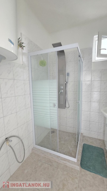 A fürdőszoba külön említést érdemel: ízlésesen kialakított, modern megoldásokkal felszerelt, ahol a minőségi burkolatok, a harmonikus színvilág és a praktikus elrendezés együttesen teremtenek elegáns, mégis otthonos hangulatot.